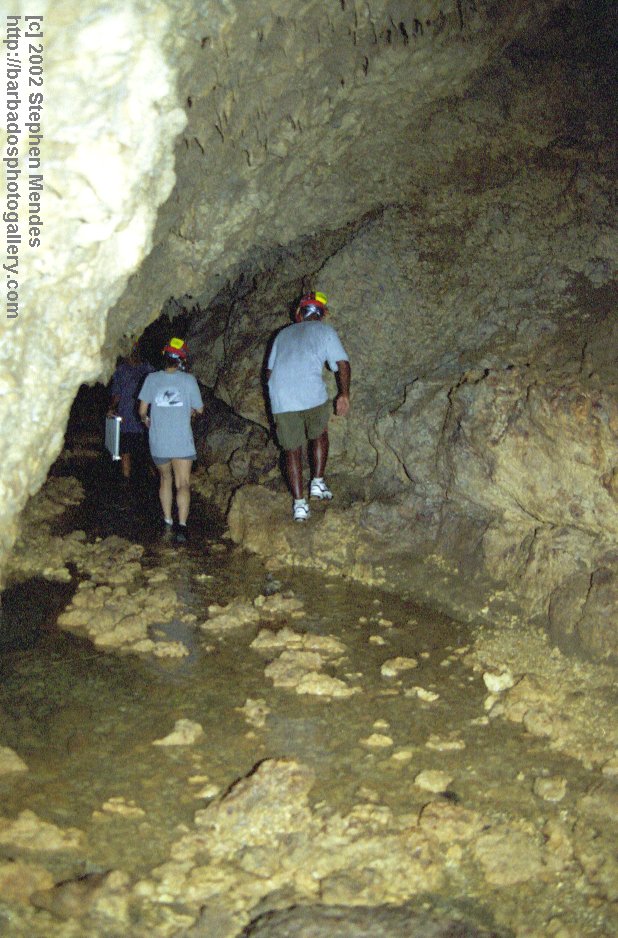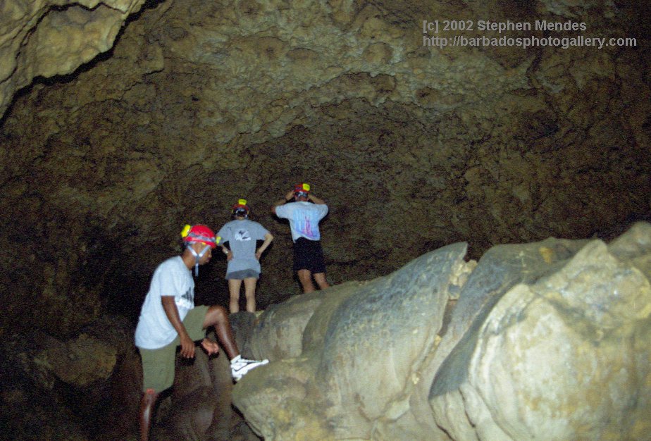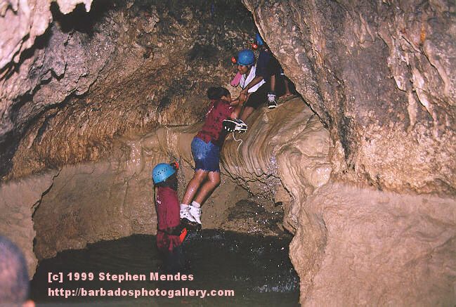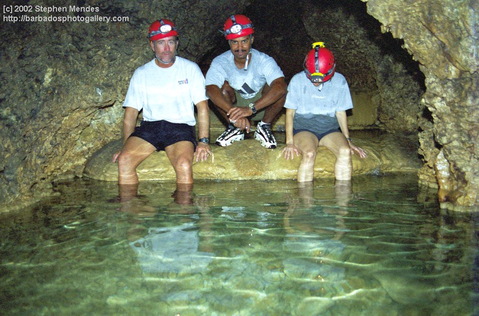 making our way through the cave involves climbing over rock, crawling under rock and wading through water.... the water level is at it's lowest at this time of year, but it is still deep enough in certain places to require swimming or else climbing around or over... the FLASHBACK to 1999 expedition shows this cavern with water in it.... notice the high water mark on the wall is above the guys head !